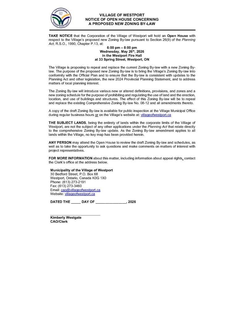 Open House: May 26th, Proposed New Zoning By Law Civic Web Link by Admin | Apr 27, 2026 | News & Notices Link to Draft By-Law: https://villageofwestport.civicweb.net/filepro/documents/62670/